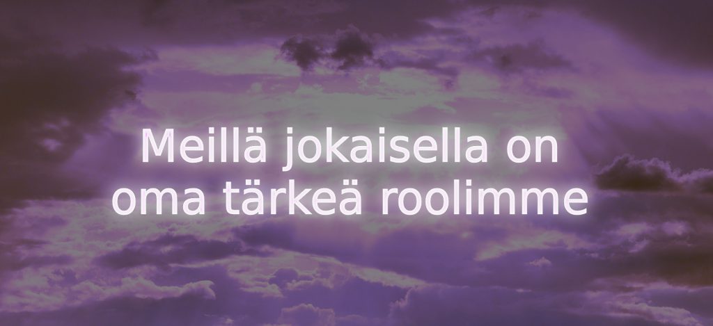 Ihmisiä taas on niin monenlaisia, ja tässä kohtaa jo ymmärrätte, että olemme kokonaisuus ja pienikin yksityiskohta. Ja meidän pitäisi ymmärtää olevamme tärkeitä, oli meillä sitten mikä tahansa rooli kulloinkin käytössä, ja näyttelemme me sitten teatterin lavalla, valkokankaalla tai telkkarissa. Tai vaikka meillä olisikin vain ääni käytössä. Mutta tarvitsemme tietyn sykäyksen, ärsykkeen tai uskalluksen, jotta uskallamme olla kulloisessakin roolissa. Jokainen palikka on ennalta määrätty.