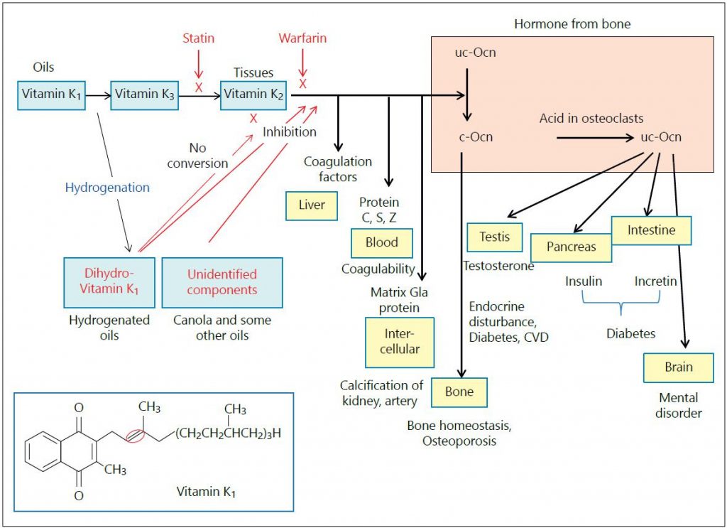 Kuva on peräisin tästä japanilaisesta tutkimuksesta. Edellämainitut tekijät estävät koagulaation ja matriksi GLA-proteiinin toimintaan tarvittavien K2-vitamiinista riippuvaisten entsyymien toimintaa. Osteoblastien ja osteoklastien normaalisti toimiessa vapautuu c-Ocn:a ja uc-Ocn:a, jotka vaikuttavat hormonien tavoin kehon eri elimissä (kivekset, haima, suolisto ja aivot). Statiinit haittaavat K2-vitamiinin toimintaa, mikä luiden heikkenemisen lisäksi heikentää myös noista ”luuhormoneista” riippuvaisten elinten toimintaa.