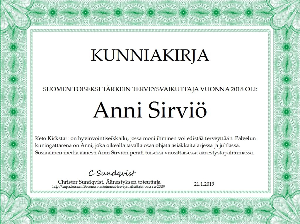 Anni Sirviö. Hänellä on aivan loistava asenne elämään ja koko ketogeeniseen elämäntapaan. Hän antaa omalla positiivisella esimerkillään intoa ja tsemppiä muille, kannustaa ja kehuu! Ei suhtaudu negatiivisesti eriäviin mielipiteisiin vaan tuo aidosti esille oman näkemyksensä perustuen tietoon ja osaamiseen sekä omiin kokemuksiinsa.